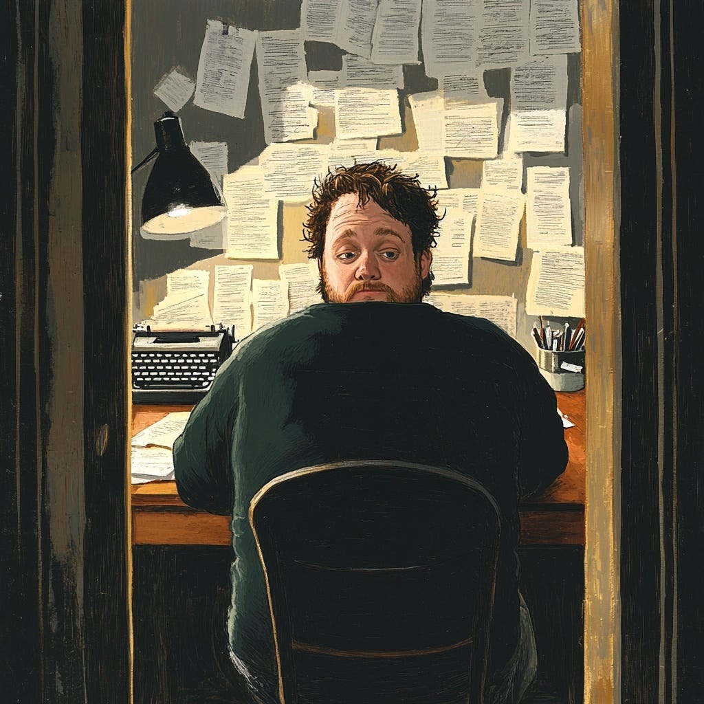 Here’s a picture of me as MidJourney imagines me to be, writing with my neck broken backwards, sad and alone. I’ve thoroughly enjoyed working with AI to accompany what I’ve written